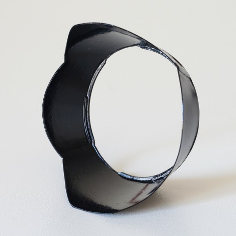 I made this hood for my Canon EF 24mm f/2.8 lens. It's made from plasticard (sheet styrene sold in model-making shops), and painted in black enamel. Even though the paint is supposed to be matt, it's still a bit more reflective than I'd like; if I were making another I'd probably try a different kind of paint.