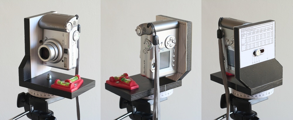 My A70 pan head is made from 12mm MDF. It's just a simple L-bracket, attached to a rotating base. If your tripod has a pan/tilt head, you could use the tripod's own pan rotation to do panoramas. But if you're not on level ground, the tripod's axis of rotation may not be vertical so you can end up with a horizon that's not straight. Incorporating the rotating base into the panhead gets around this problem. You can use the tripod's pan/tilt to level the pan head; then you can guarantee the rotation will be in the horizontal plane.