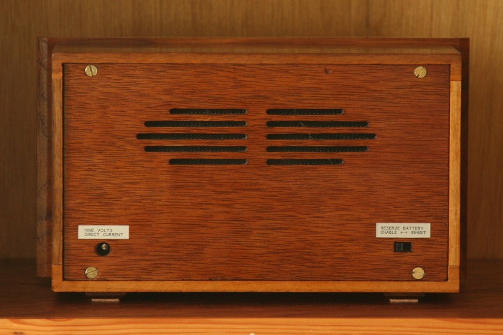 The back panel was cut from a scrap of ¼" plywood, and stained to approximately match to the colour of the walnut. I cut some slots for ventilation and to let the alarm sound out. If you look closely you may notice that the vents have mesh inside (to keep spiders out!) - the mesh came from a frying pan splatter guard bought from a pound shop. I don't like to spend more than I have to!